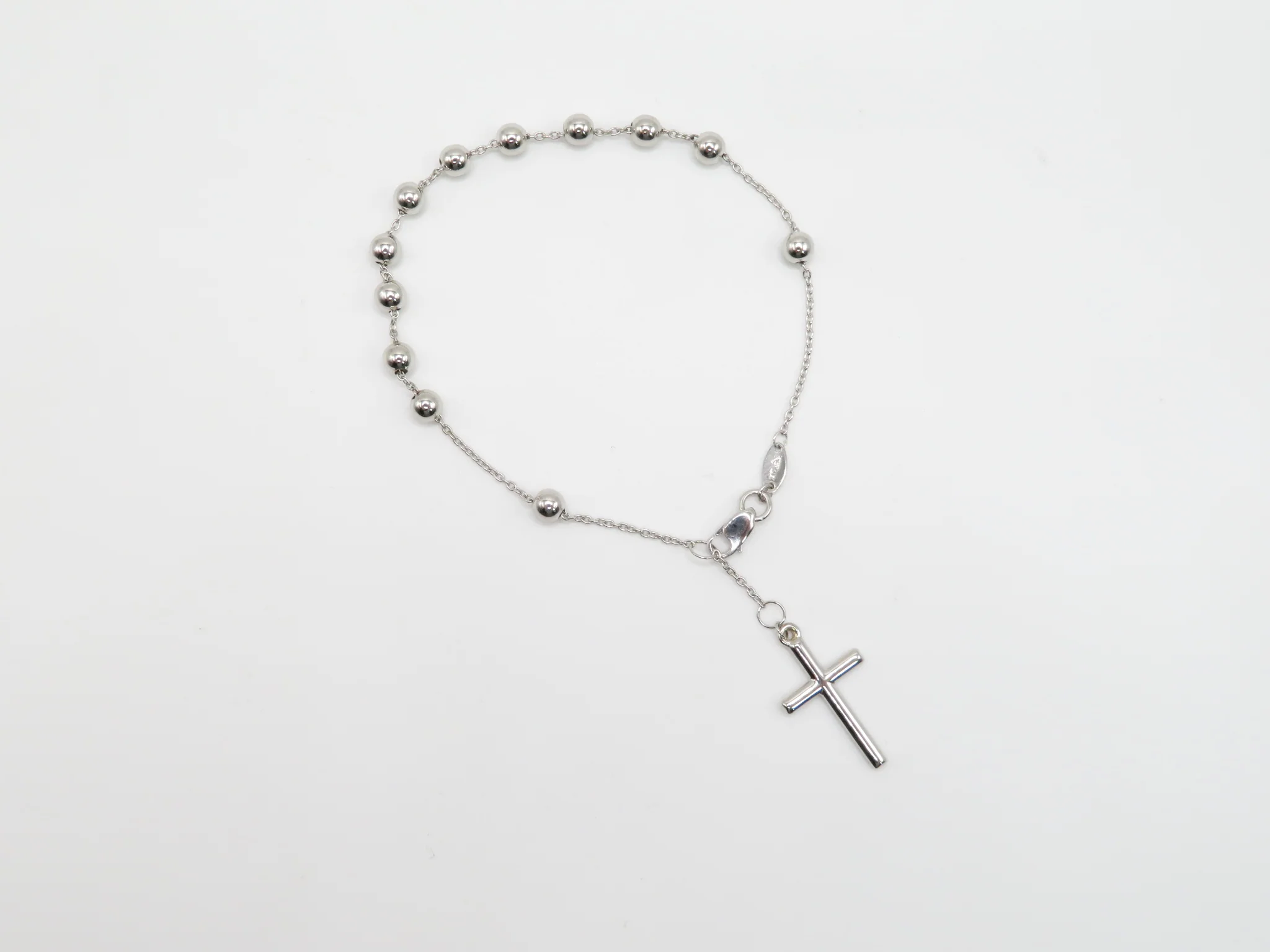 Each bead of this Rosary bracelet symbolizes a prayer, with 12 beads total and a classic rounded cross to finish the strand. This bracelet is one of our most popular styles and a perfect gift. Adjustable using the two jump loops, the cross is meant to dangle. Now available in yellow and white gold.