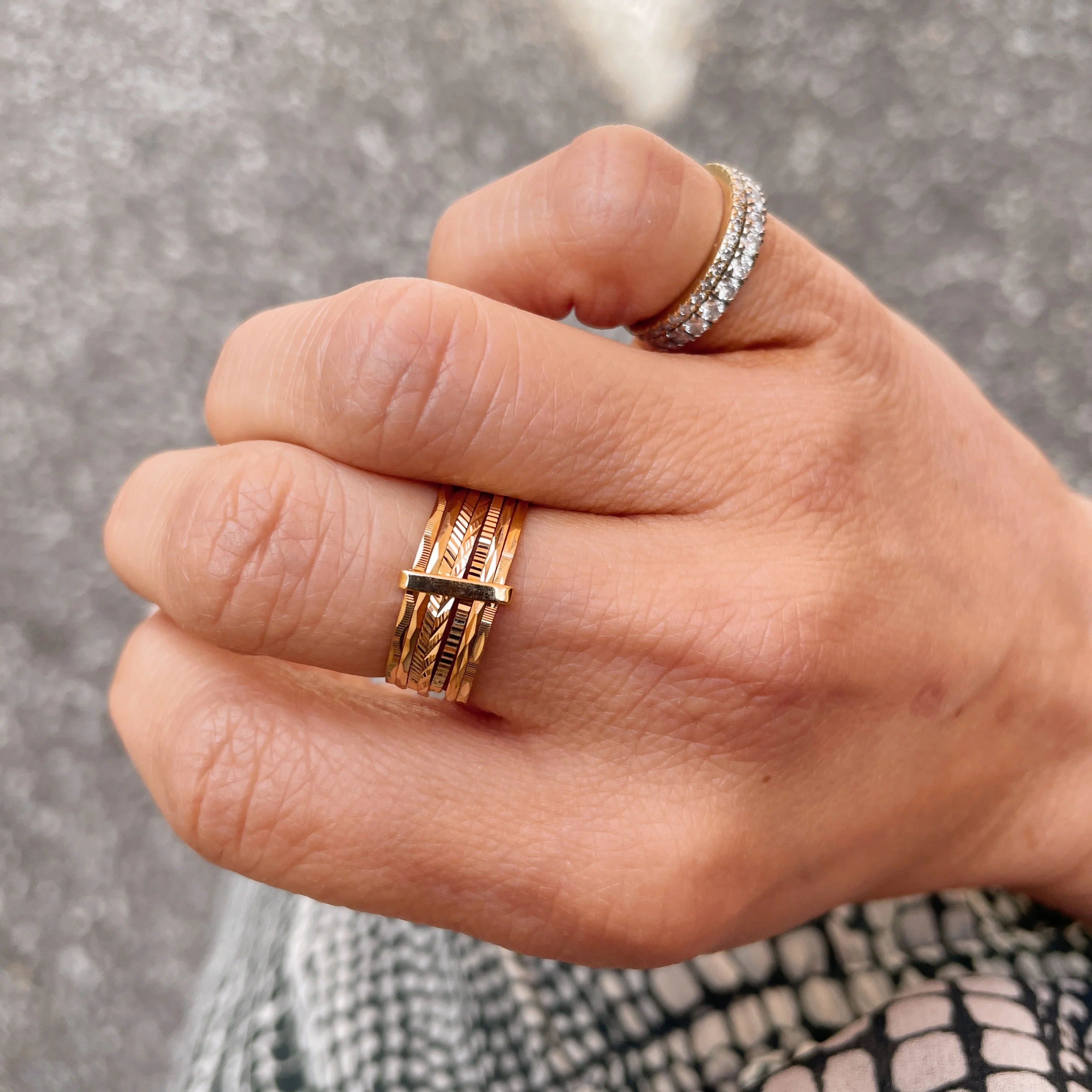 This traditional Portuguese Seven Day ring also known as the "Anel Sete Dias", consist of seven, uniquely textured bands. Each band is made to symbolize a day of the week and are held together by a single bar of gold, available plain or engraved.
